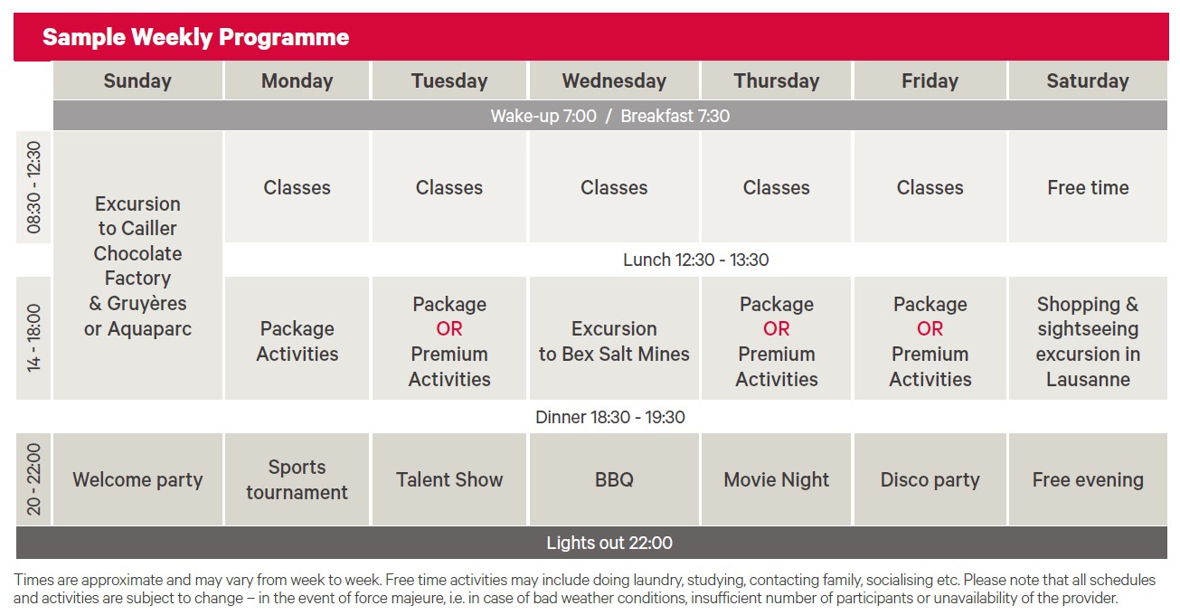- wycieczkach całodniowych, np. Alpine Zoo, Aquapark, Cailler Chocolate Factory, Gruyères, Chillon Castle, Food Museum Alimentarium; UWAGA - wycieczka całodniowa (zazwyczaj w sobotę) gwarantowana przy zakupie min. 2 tygodniu obozu.