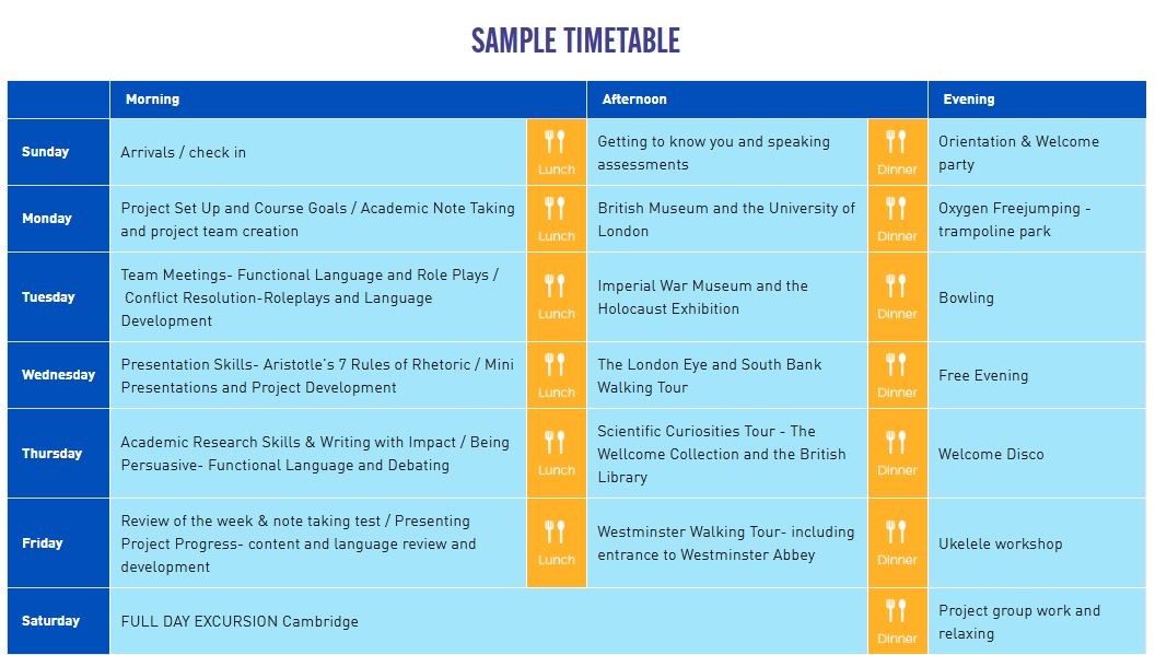 Oferowany program zajęć jest wymagający akademicko i dostosowany do potrzeb ambitnej młodzieży w wieku 14-17 lat. Skupia się on na komunikacji międzykulturowej, zwiększania pewności siebie podczas mówienia, szlifowaniu umiejętności prezentacji oraz pracy grupowej w języku angielskim. Uczestnicy obozu biorą udział w zajęciach i projektach grupowych, wykonując powierzone zadania i prezentując ich wyniki. Są oni również uczeni robienia notatek pod kątem późniejszej nauki na uczelniach wyższych. Po lekcjach uczniowie biorą udział w zajęciach pozalekcyjnych, m.in. w zwiedzaniu Londynu lub zabawach integracyjnych. Poza atrakcyjnym spędzeniem czasu aktywności pozalekcyjne stwarzają także okazję do dalszej nauki języka i zdobywania wiedzy. Karta na komunikację miejską - w cenie pakietu.