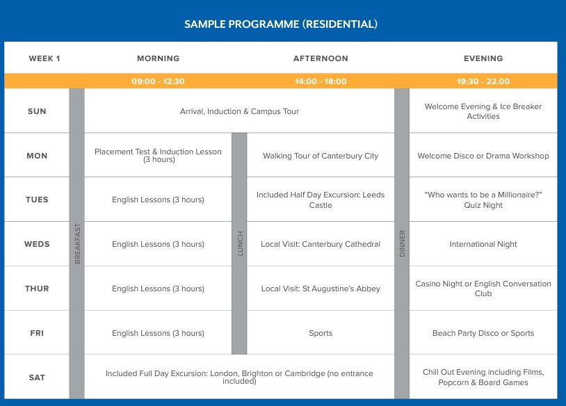 Nasz kurs skupia się na poprawie umiejętności komunikacji uczniów oraz zwiększania ich pewności siebie i motywacji. Doświadczeni nauczyciele pilnują, aby studenci używali języka w praktyczny sposób, w różnych, realistycznych sytuacjach. Uzupełnieniem zajęć językowych są wycieczki pozwalające na poznanie Canterbury i jego okolic, a także popołudniowe i wieczorne aktywności, w czasie których uczniowie mogą zintegrować się ze swoimi kolegami z klasy w czasie licznych zabaw.