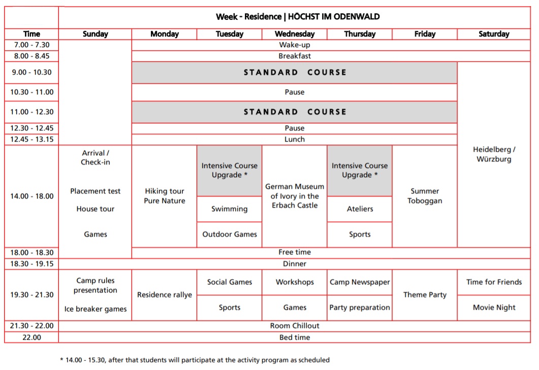 Dzięki temu, że dzieci cały czas przebywają ze sobą, ćwiczą język nie tylko na lekcjach, ale również poza nim, w trakcie zabaw i wspólnie organizowanego czasu wolnego. Organizowane są zajęcia sportowe, wyjścia na miasto i po okolicznych szlakach przyrodniczych, imprezy integrujące (zabawy powitalne, dyskoteka, karaoke), warsztaty artystyczne (malarstwo, teatr, szkicowanie) i wiele innych. W każdą sobotę organizowane są także wycieczki całodzienne do atrakcyjnych miejsc takich jak: Frankfurt, Würzburg czy Heidelberg.