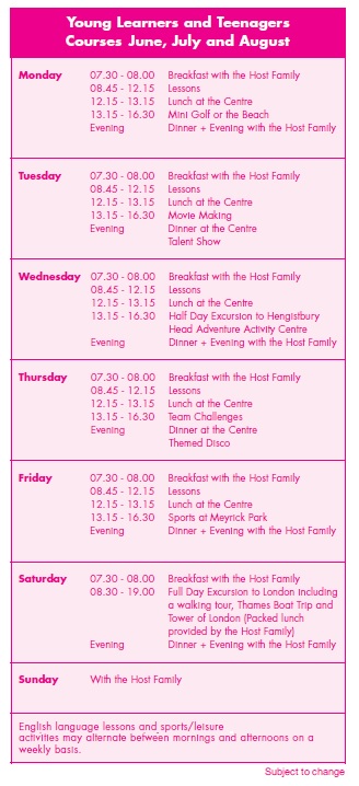 Podczas obozu dzieci dzielone są na dwie grupy wiekowe: 10-13 i 14-16 lat. Nauka angielskiego odbywa się nie tylko podczas codziennych zajęć językowych, lecz również w trakcie programu dodatkowego. Gwarantujemy różnorodność aktywności pozalekcyjnych, w tym: zajęcia sportowe (mini-golf, siatkówka, piłka nożna, koszykówka, tenis ziemny i stołowy, taniec), warsztaty artystyczne (fotografia, tworzenie filmów, zajęcia plastyczne, ceramika, teatr) gry i zabawy zespołowe (mini-olimpiady, zawody i wyzwania, zabawy na plaży), zajęcia integrujące i rekreacyjne (dyskoteka, poszukiwanie skarbów, pokaz talentów, karaoke) i inne (np. wieczory filmowe, quizzy, pokazy mody, zajęcia tematyczne). Młodzież ma także okazję uczestniczyć w wycieczkach półdniowych (Trampoline Park, rejsy łodzią. Monkey World, park rozrywki, park wodny itp.) i całodniowych do takich lokalizacji jak: Londyn, Bath i Stonehenge, Harry Potter Studio, Oxford, Brighton i inne.