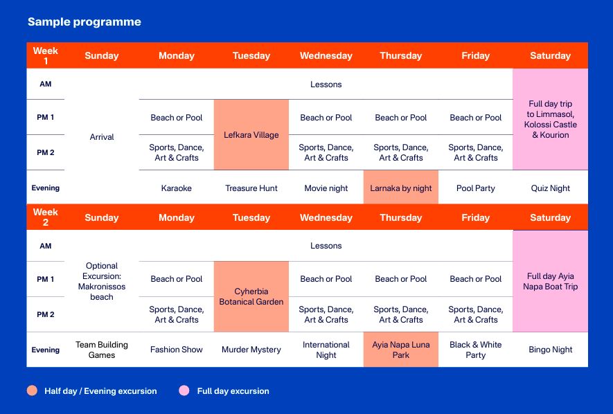W trakcie obozu uczestnicy, oprócz zajęć językowych, mają zaplanowany bogaty program aktywności pozalekcyjnych. Zajęcia popołudniowe to m.in. wyjścia na plażę czy basen, zajęcia sportowe czy kulturalne, a wieczorne to np. dyskoteka, quizzy, karaoke, talent show, pokazy filmowe itp. Organizujemy też, w każdym tygodniu, jedną wycieczkę całodniową i dwie półdniowe (zazwyczaj wieczorne) do atrakcyjnych miejsc w okolicy. W ich trakcie studenci odwiedzają m.in. Troodos, Fasouri czy Mall, Nikozję, Larnakę lub mają okazję udać się na rejs statkiem.