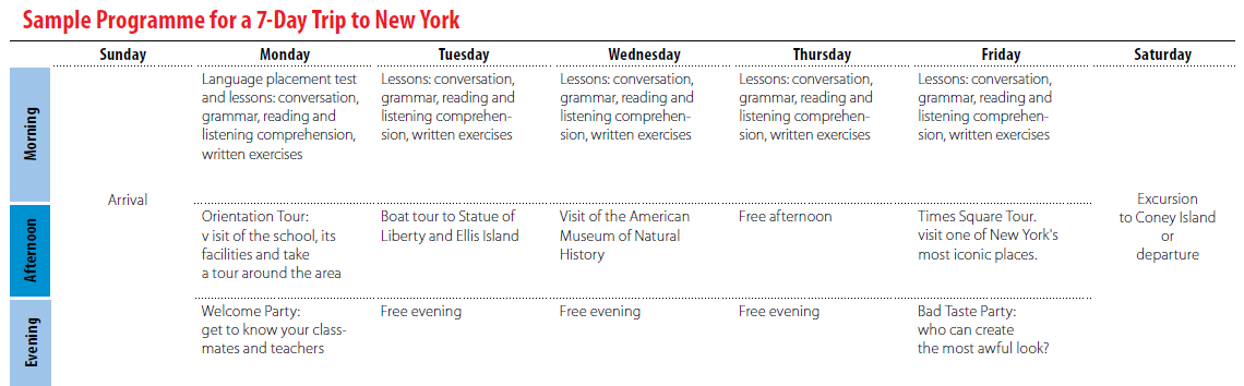 Oprócz zajęć językowych, proponujemy bogaty program zajęć dodatkowych, z gwarantowanymi wycieczkami półdniowymi i całodniowymi (całodniowa - min. 2 tygodnie kursu). Za dodatkową opłatą można wykupić wycieczki fakultatywne np. do Niagara Falls, Bronx Zoo czy na Statuę Wolności. W standardowym programie mamy m.in. zajęcia sportowe, kręgle, kino, karaoke, dyskotekę, zwiedzanie muzeów itp.