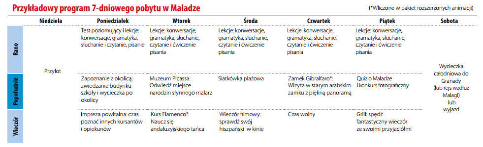 Oprócz zajęć językowych oferujemy pakiet aktywności pozalekcyjnych. W każdym tygodniu gwarantowana wycieczka półdniowa, a przy zamówieniu min. 2 tygodni obozu - wycieczka całodniowa w weekend (np. do Sewilli czy Granady). Oprócz zwiedzania Malagi, nasi studenci spędzają wspólnie czas na imprezach, pokazach flamenco, podczas wieczornych quizów czy grilla i turniejów siatkówki plażowej. Możliwe także wykupienie dodatkowego pakietu aktywności, tzw. Fun Pack.