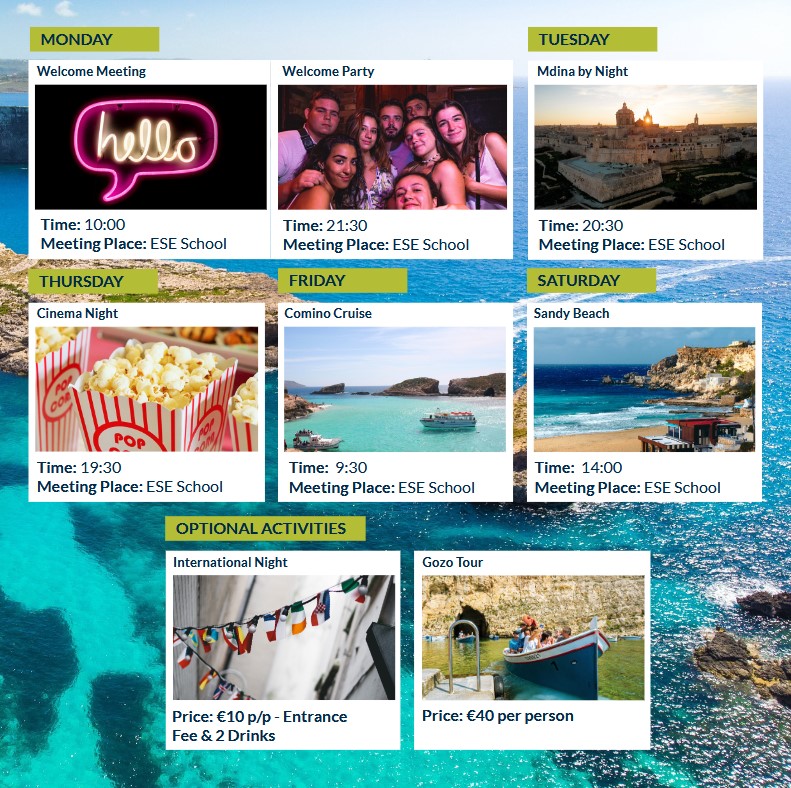 W programie zapewnione zajęcia angielskiego ogólnego w wybranej intensywności (przy kursie 30-godzinnym należy pamiętać, że niektóre aktywności rekreacyjne nie będą dostępne, bo mogą nałożyć się na zajęcia lekcyjne) oraz zakwaterowanie (zgodnie z rezerwacją w nowym, 3-gwiazdkowym hotelu tuż obok szkoły lub u rodziny goszczącej; w obu opcjach wyżywienie HB - śniadanie i obiadokolacja). W programie gwarantowane także: program zajęć pozalekcyjnych, transfery na lotnisko, materiały szkoleniowe i certyfikat. W pakiecie zajęć rekreacyjnych takie aktywności jak: impreza powitalna, kręgle, wypad na plażę, rejs statkiem, wyjście do kina, wycieczki (Comino, Valetta, Mdina, park wodny). Istnieje również możliwość wykupienia dodatkowych aktywności weekendowych (np. nurkowanie, wycieczka na Gozo, paint ball, jeep safari itp.)