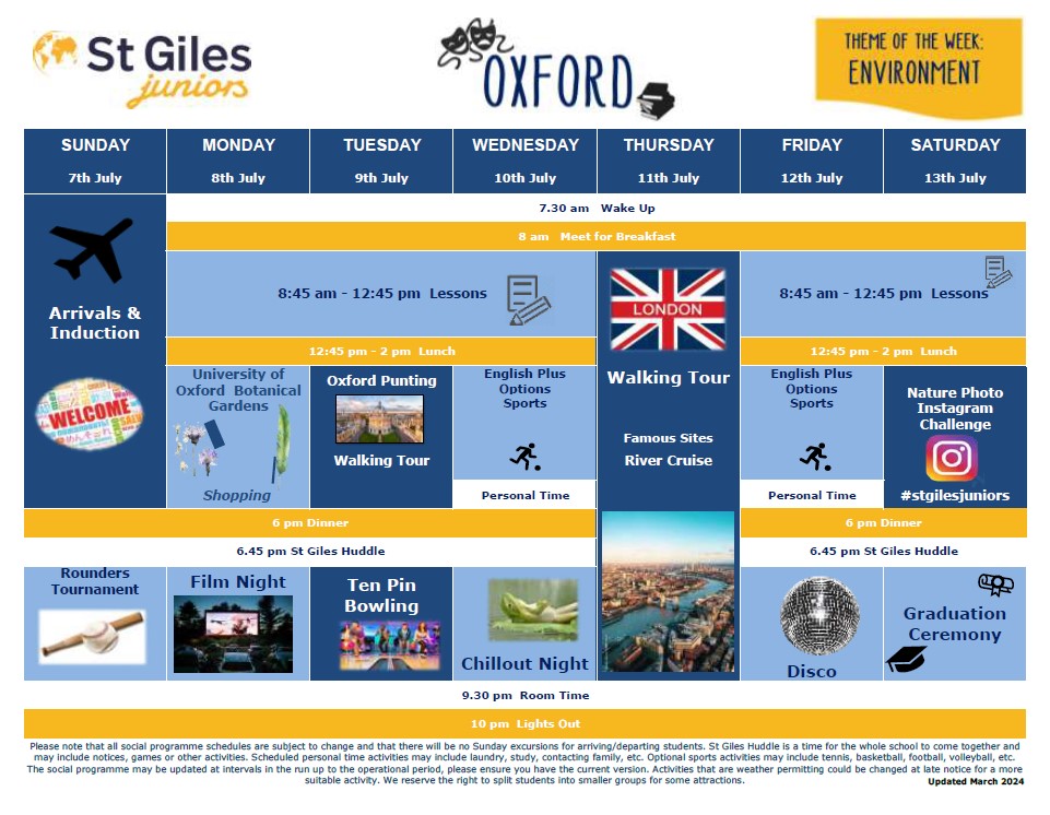 Oprócz zajęć lekcyjnych w każdym tygodniu gwarantowane jedna wycieczka całodniowa (m.in. Londyn, Stratford Upon Avon, Bath, Bournemouth) i trzy wycieczki półdniowe (m.in. wycieczki do lokalnych muzeów, punting po rzece, wizyty na uniwersytetach itp.). Młodzież uczestniczy także w bogatym programie dodatkowym popołudniami i wieczorami - przykładowe aktywności to np. wieczory filmowe, pokaz talentów, karaoke, dyskoteka, quizy, zabawy integracyjne.