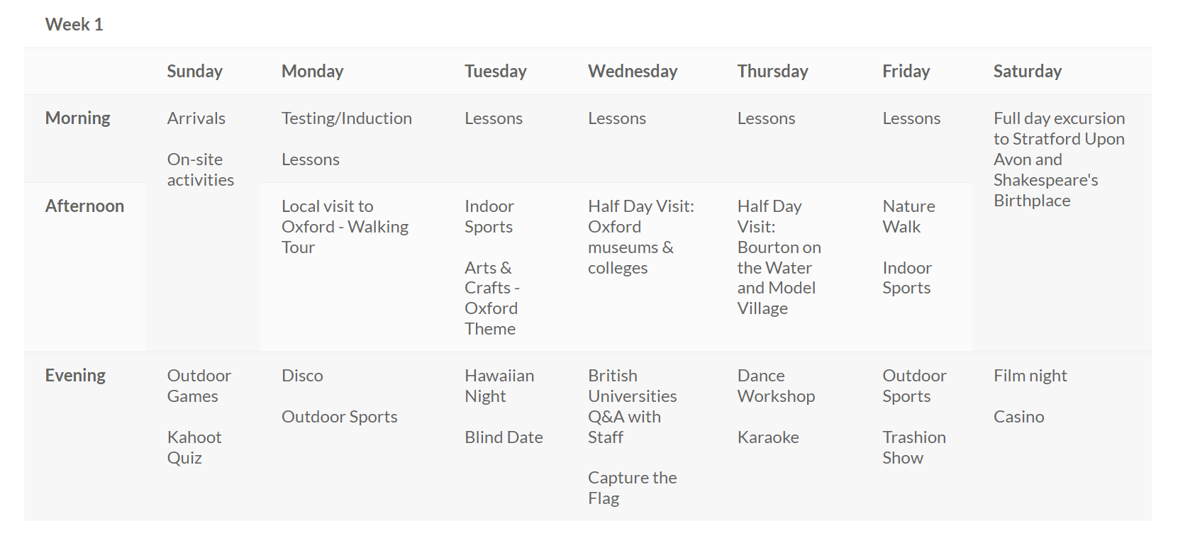 Uczestnicy w trakcie obozu uczestniczą w zajęciach językowych (20 lekcji//tydz.) w dobrze wyposażonych salach lekcyjnych (m.in. tablice interaktywne). Dodatkowo oferowany jest bogaty program aktywności pozalekcyjnych, organizowany pomiędzy zajęciami i wieczorami. Aktywności odbywają się bądź to na terenie campusu lub poza nim i mogą obejmować takie wydarzenia jak: zajęcia sportowe (piłka nożna, mini-olimpiada, zbijak, tenis stołowy, siatkówka, koszykówka), zajęcia terenowe (podchody, poszukiwanie skarbów), warsztaty (np. teatralne) i inne (np. karaoke, pokaz talentów, gry zespołowe, dyskoteka itp.). W programie przewidziane również wycieczki - w każdym pobycie 2-tygodniowym gwarantowane m.in. 2 lokalne, piesze wizyty po Oxfordzie, 2 wycieczki półdniowe do pobliskich miast lub atrakcji turystycznych, wycieczka całodniowa (zazwyczaj w sobotę np. Londyn, Stratford Upon Avon, Cambridge).