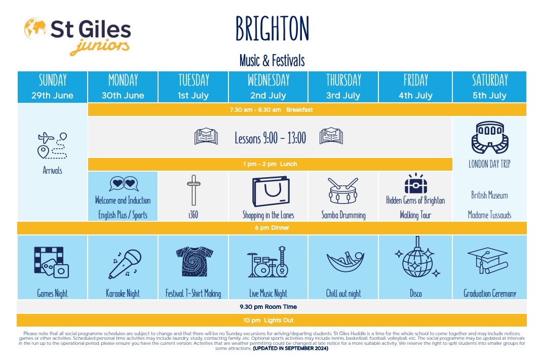 W każdym tygodniu gwarantowany bogaty program aktywności pozalekcyjnych, w tym max. dwie wycieczki całodniowe (do takich miejsc jak Londyn, Windsor, Cambridge, Eastbourne, Warner Bros Studio) i trzy wycieczki półdniowe (np. Brighton Pavilion, Brighton Pier, Arundel Castle, British Airways i360, North Laine, Sea Life Centre). Nadto oferujemy różnorodne aktywności popołudniowe i wieczorne, w tym sportowe (sporty wodne, mini-olimpiada), artystyczne (zajęcia teatralne, warsztaty artystyczne, pokazy mody, zajęcia taneczne), integracyjne (dyskoteka, barbeque) i inne (np. zajęcia z gotowania).