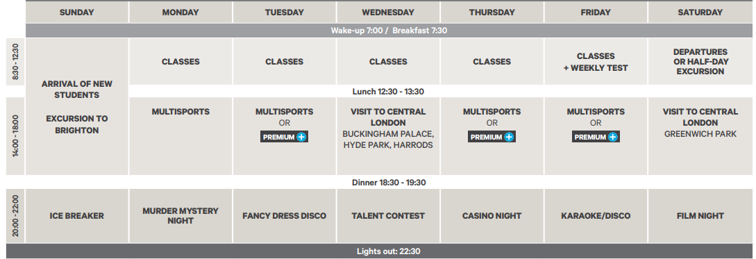 Oprócz lekcji proponujemy studentom bogaty program dodatkowy. Popołudniu zachęcamy do udziału w zajęciach sportowych (koszykówka, zbijak, siatkówka, piłka nożna, tenis). Wieczorami organizujemy zajęcia typu: dyskoteka, noc gier i quizzów, pokaz talentów, karaoke, pokaz mody, wieczór filmowy i inne. Istnieje również możliwość wykupienia dodatkowych, popołudniowych pakietów aktywności: zajęcia z gotowania, tenisa ziemnego czy pakietu adrenalina (wizyta w parku linowym, go-karty, paintball). W każdym tygodniu przewidziane również dwie wycieczki półdniowe do Londynu do jego największych atrakcji (np. Big Ben, Buckingham Palace, Hyde Park, Harrods, House of Parliament itp.) oraz wycieczka całodniowa (zazwyczaj w niedzielę; w takie miejsca jak: Brighton lub Canterbury. UWAGA - dla pobytów tygodniowych, wycieczki weekendowe są niedostępne.