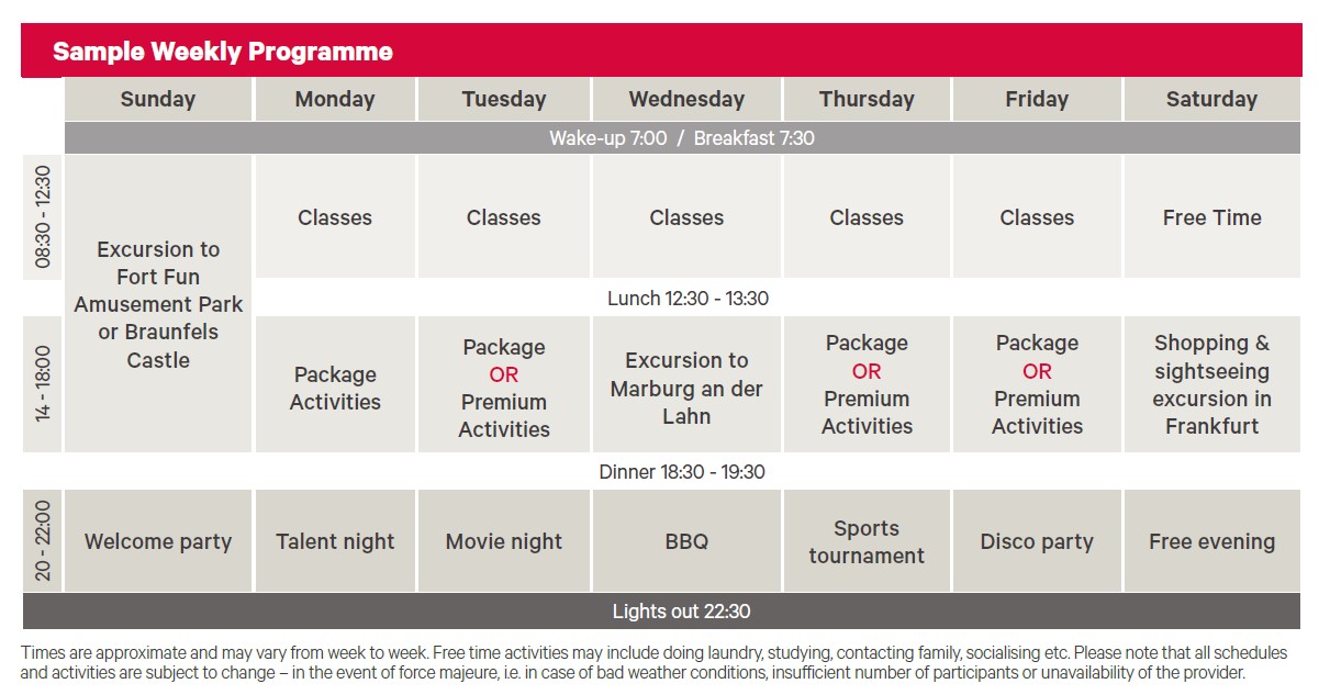 Położone w górnej części doliny Lahn, 120 km od Frankfurtu, nasze centrum znajduje się wśród budowli należących do typowej architektury średniowiecznej, w pobliżu zamku usytuowanego na szczycie wzgórza. Dzięki spokojnemu otoczeniu i rozwiniętej infrastrukturze ośrodek jest bardzo dobrze przystosowany do przyjmowania młodych uczniów. Zapewniamy duże sale lekcyjne, wygodne sypialnie i mnóstwo części wspólnych, w których studenci mogą relaksować się, np. grając w piłkarzyki czy gry planszowe. Na terenie obozu uczniowie mają dostęp do bezpłatnego Wi-Fi. Boiska sportowe, korty tenisowe i odkryty basen znajdują się zaledwie kilka metrów dalej, dzięki czemu studenci mogą w pełni korzystać z szerokiego wyboru pobliskich aktywności.