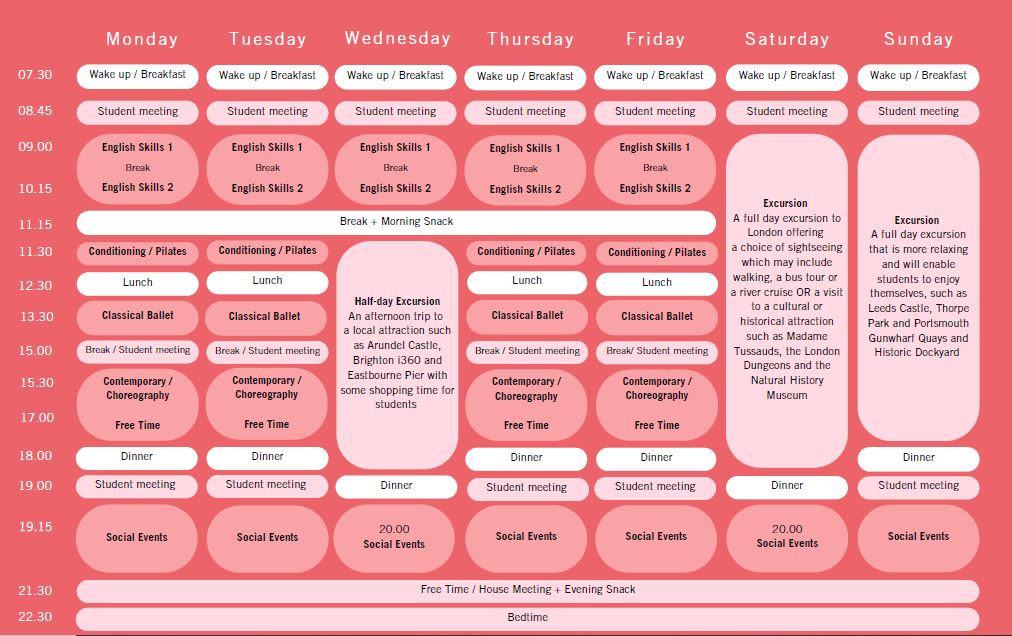 Program obozu łączy ze sobą naukę języka z nauką tańca. Obejmuje on: