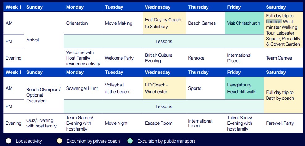 - wycieczki półdniowe po mieście i okolicy (zazwyczaj środa i piątek) np. Salisbury, Winchester, Christchurch, Hengistbury, Durdle Door Beach, Russell Cotes Museum