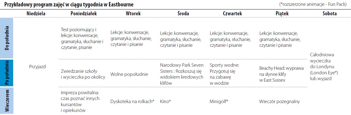 Na naszym obozie, oprócz zajęć lekcyjnych angielskiego, proponujemy szeroki wachlarz zajęć dodatkowych, w tym: zajęcia sportowe (np. siatkówka plażowa, piłka nożna, zumba, fitness), przyjęcie powitalne, grill, zwiedzanie, karaoke, międzynarodowe imprezy integracyjne i wiele innych aktywności. Istnieje możliwość wykupienia zwiększonych ilości zajęć pozalekcyjnych (tzw. Fun Pack)! W każdym tygodniu organizowane są także wyjścia półdniowe oraz jedna wycieczka całodniowa w weekend (przy zamówieniu obozu co najmniej 2-tygodniowego).