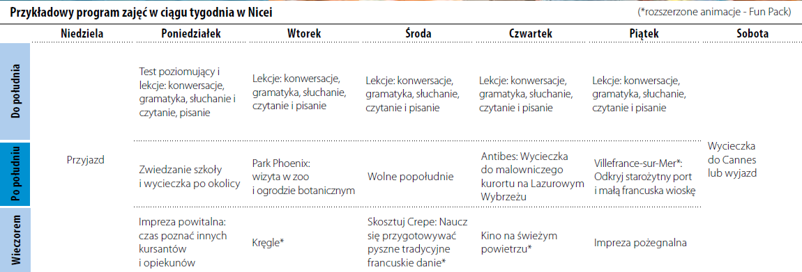 Oprócz kursu językowego i zakwaterowania, będziesz mieć aktywnie zorganizowany czas wolny. Atrakcyjne zajęcia dodatkowe sprawią, że obóz językowy będzie dla Ciebie niezapomnianym doświadczeniem! W ramach zajęć pozalekcyjnych oferujemy różnorodne rozrywki, począwszy od sportu, jak na przykład siatkówka plażowa czy kręgle, poprzez urozmaicony program wieczorny - kino na powietrzu i imprezy oraz grill, po zwiedzanie Nicei oraz wycieczki do Grasse, Eze Village czy St. Paul de Vence i słynnego Monako! Nasi opiekunowie dbają o to aby uczestnicy obozu w bezpieczny i zorganizowany sposób mogli również skorzystać z bujnego życia nocnego Nicei.