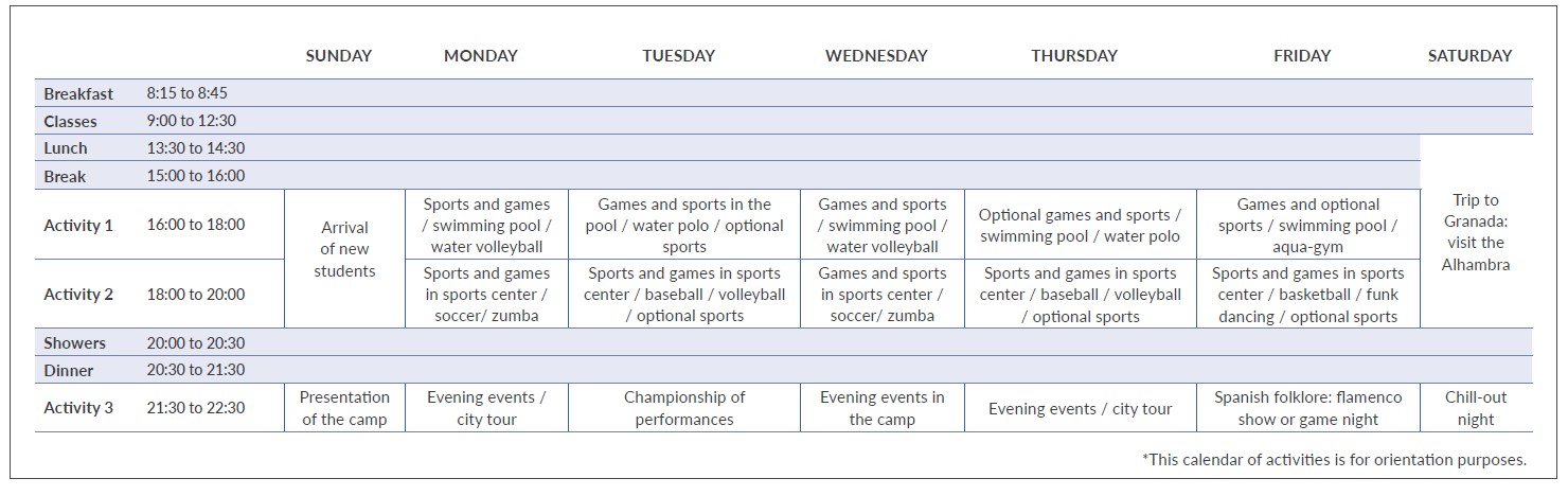 Oprócz zajęć językowych, studenci uczestniczą w bogatym programie dodatkowym. Każdego dnia organizowane są różne aktywności: sportowe (piłka nożna, pływanie, tenis itp.), artystyczne (warsztaty teatralne, filmowe, muzyczne, plastyczne itp.), kulturalne (dyskoteki, gry i zabawy integracyjne itp.). Każdy dwutygodniowy program obejmuje co najmniej jedną wycieczkę całodniową (w weekend), np. Seville, Granada, La Alhambra, Tarifa, Aquamijas Water Park, Ronda, Bioparc Zoo and Fuengirola Beach oraz dwie wycieczki półdniowe, np. Marbella City Tour, Water Park, Amazon Adventure Park, Bioparc Zoo, Puerto Banús. Istnieje również możliwość wykupienia rozbudowanych zajęć opcjonalnych (za dodatkową opłatą), np. treningi piłki nożnej, golfa, tenisa, paddle tennisa, jazdy konnej. Można także kupić zestaw odzieży obozowej (koszulki, bluza, spodenki, czapka), za dodatkową opłatą (130 EUR).