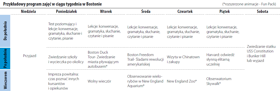 W trakcie obozu organizujemy młodzieży również czas wolny. Często wychodzimy na miasto, aby lepiej poznać tutejszą okolicę i mieszkańców. Studenci mogą w ten sposób zobaczyć m.in. Chinatown czy odwiedzić Harvard, a także odwiedzić tutejsze Zoo lub Obserwatorium wielorybów. ale także wypocząć na pikniku w parku lub podczas rejsu statkiem, a także rywalizować w trakcie zajęć sportowych (kajaki, piłka nożna, fitness, zumba). W weekend organizujemy ekscytujące, całodniowe wycieczki - miejscami wartymi odwiedzenia są niewątpliwie: Bunker Hill, USS Constitution, Fenway Park, Copley Square czy Black Bay District. Istnieje także możliwość wykupienia pakietu dodatkowych animacji (Fun Pack).