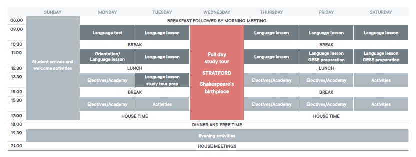 Zajęcia prowadzą wykwalifikowani nauczyciele, których celem jest rozwijanie umiejętności językowych uczniów, jak również pomoc w lepszym rozumieniu zarówno samego języka, jak i lokalnej kultury. Uczniowie, oprócz zajęć językowych zdobywają nowe umiejętności w zakresie wybranej przez siebie opcji, uczą się praktyki i teoretycznych zasad, posługując się angielskim i wykorzystując go w praktyczny sposób. Uczniowie mają również możliwość przygotowywania się do egzaminów językowych czy uczestniczenia w bardziej ukierunkowanych zajęciach, tj. Sztuka w Cambrigde, Sporty Brytyjskie, Umiejętności Egzaminacyjne, Fotografia i Film, Prezentacje i Debaty. Dla osób chętnych w rozwoju w konkretnej dziedzinie, możliwe jest uczestnictwo w tzw. „Akademiach” (dodatkowo płatne) – zajęciach z trenerem/nauczycielem w celu rozwoju konkretnych zainteresowań czy umiejętności (tutaj – treningi tenisa ziemnego, jazdy konnej lub robotyka). Ponadto dzieci mogą uczestniczyć w zajęciach popołudniowych i wieczornych, w tym m.in. koszykówka, zajęcia teatralne, piłka nożna, dziennikarstwo, fotografia, rękodzieło, warsztaty z literatury brytyjskiej, gotowanie, taniec, krykiet, piłka ręczna, zbijak, tenis, piłka siatkowa itp. Gwarantowane są także różne wyjścia do atrakcji turystycznych np. do Londyn, Cambridge, Bristolu czy na Zamek Norwich i Zamek Warwick.