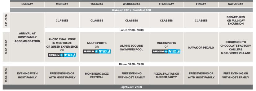 - wycieczki całodzienne np. Alpine Zoo, Aquapark, Cailler Chocolate Factory, Gruyères, Chillon Castle, Food Museum Alimentarium; UWAGA - wycieczka całodniowa (zazwyczaj w sobotę) gwarantowana przy zakupie min. 2 tygodniu obozu, a niedziela to zazwyczaj dzień wolny, spędzany z rodziną goszczącą.