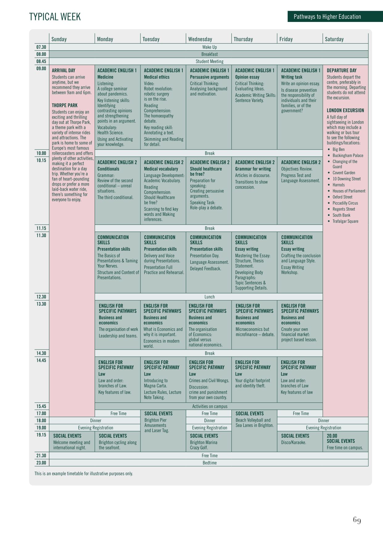 Obóz w Brighton został zaprojektowany specjalnie dla starszej młodzieży (16-20 lat), która chce przygotowywać się do dalszej nauki lub pracy w anglojęzycznym środowisku. Lekcje odbywają się rano i popołudniu. Na program "Pathway to Higher Education" składają się m.in. zajęcia: