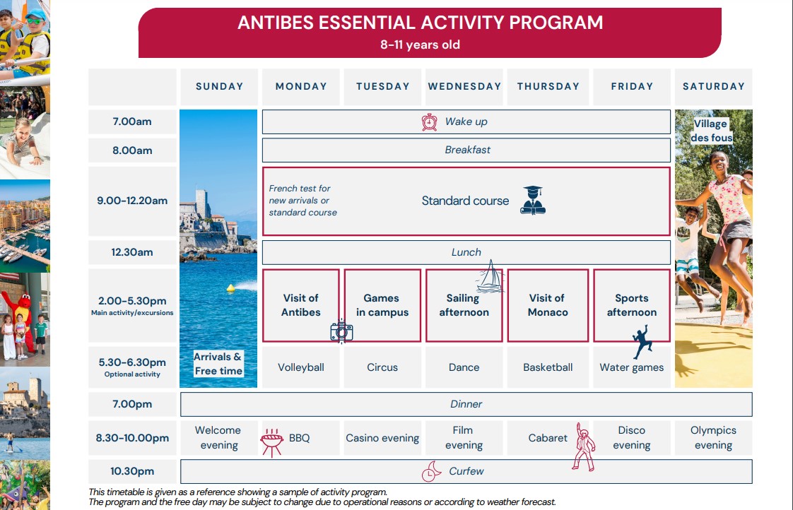- wycieczki: wycieczka półdniowa w tygodniu (np. Cannes, Park Rozrywki) i jedna wycieczka całodniowa w weekend (dla zamówień na min. 2 tygodnie; tu np. Monaco, Nicea, Park Wodny)