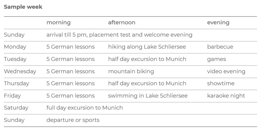 Na obozie zajęcia lekcyjne odbywają się rano, natomiast po południu organizowane są różnorodne aktywności, m.in: barbeque nad rzeką, rafting, gra w siatkówkę, wieczór filmowy czy zakupy na mieście (min. dwie różne aktywności dziennie). Oferta obejmuje także zwiedzanie miasta i okolic - min. 2 wycieczki w tygodniu np. po Monachium, do zamku Nymphenburg, obozu w Dachau, Starnberger See, BMW World czy nad pobliskie jeziora lub w góry. Konieczność zakupienia biletów komunikacji miejskiej we własnym zakresie (ok. 40 EUR/tydz.)