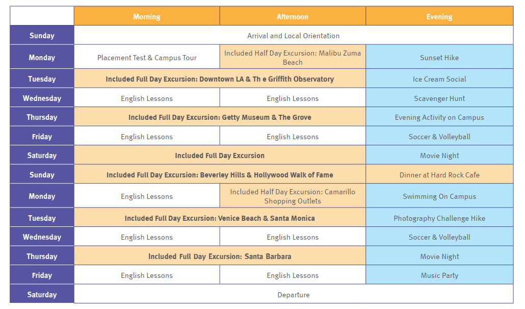 Nasz obóz w Kalifornii cieszy się szczególnym zainteresowaniem głównie przez rozbudowany program zajęć dodatkowych. Ten kurs zawiera pełny program zajęć języka angielskiego, nadzorowane wycieczki, zajęcia sportowe oraz inne, odbywające się na kampusie, takie jak: warsztaty z rękodzieła artystycznego, zajęcia teatralne czy zajęcia wieczorne (np. dyskoteki, zabawy grupowe). Studenci w każdym tygodniu mają zagwarantowane 3 całodniowe wycieczki (np. do Santa Monica, Beverly Hills i Hollywood czy Six Flags Theme Park, Muzeum Getty, Santa Barbara, Plaża Venice) oraz wycieczkę półdniową (np. Plaża Malibu, Camarillo Shopping Outlets, Port Hueneme Beach).