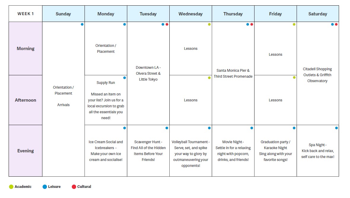 Program obejmuje 3 wycieczki całodzienne w ciągu 14 dni kursu (m.in. Hollywood, Beverly Hills, Griffith Observatory, Santa Monica, LA Union Station, Chinatown, Getty Center, Malibu and Getty Villa) oraz kilkanaście różnorodnych aktywności na kampusie, które odbywają się po lekcjach (zajęcia sportowe, np. koszykówka, siatkówka, piłka nożna; karaoke, dyskoteka, poszukiwanie skarbów, wieczory filmowe, projekty artystyczne itp.). Na miejscu możliwe jest także wykupienie wycieczek opcjonalnych w niedzielę do takich miejsc jak: Disneyland, Universal Studios czy park rozrywki Six Flags. Wszystkie zajęcia dodatkowe są przemyślane tak, by były kontynuacją nauki w trakcie zabawy. Dzięki temu uczniowie nabierają życiowych umiejętności w korzystaniu z języka obcego i integrują się w międzynarodowym środowisku innych uczestników kursu.