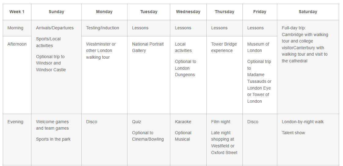 Poza zajęciami językowymi (20 lekcji x 45 min w tygodniu) w międzynarodowych grupach (max. 17 osób), uczestnicy obozu mogą wziąć udział w licznych aktywnościach. Program pozalekcyjny obejmuje zajęcia sportowe (piłka nożna, koszykówka, tenis stołowy) integracyjne (dyskoteka, karaoke, pokaz talentów) czy tematyczne (pokaz talentów, poszukiwanie skarbów, wieczory filmowe). Przewidziane są także półdniowe wycieczki (np. Tower Bridge, rejs po Tamizie, British Museum, National Gallery) oraz całodniowa wycieczka w weekend (Brighton, Canterbury, Cambridge). Istnieje możliwość wykupienia alternatywnych wycieczek weekendowych (np. Thorpe Park, Zamek Windsor, Oxford) czy aktywności wieczornych (kręgle, muzeum figur woskowych Madame Tussauds, wyjście do kina/teatru/na musical).
