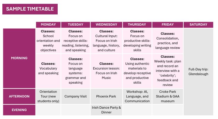 Oprócz zajęć językowych gwarantowany ciekawy program aktywności. W każdym tygodniu dwie aktywności (warsztatowe) skupiają się na tematykach bliskiej młodzieży. Kolejne dwie to zazwyczaj wycieczki popołudniowe po ciekawych miejscach w Dublinie. Raz w tygodniu, wieczorem, zaplanowana konkretna forma spotkania towarzyskiego (np. pizza night, dyskoteka itp). Soboty dedykowane są wycieczce całodziennej, pozwalającej na szersze poznanie Irlandii (np. Glendalough). W trakcie obozu gwarantowana karta miejska pozwalająca na podróżowanie po całym mieście na wycieczki zorganizowane czy samodzielne odkrywanie miasta. Należy pamiętać, że podczas tej formy obozowej młodzież traktowana jest już jako "młodzi dorośli" - nie zapewniamy całodobowej opieki.