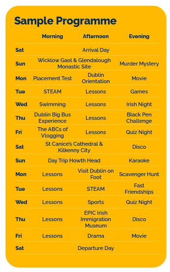 Dużą część obozu stanowią lekcje językowe, podczas których uczestnicy szlifują swoje umiejętności z zakresu czytania, pisania, mówienia i słuchania. Zajęcia są tak zaplanowane, aby angażować uczniów, skupić się na ich zainteresowaniach i poprawiać ich zdolność komunikacji. W każdym tygodniu uczestnicy obozu biorą także udział w lekcjach STEAM (Science, Technology, Engineering, Arts, Maths), w czasie których pogłębiają swoją wiedzę z tych przedmiotów. Uzupełnienie lekcji stanowią warsztaty prowadzone przez instruktorów ze szkoły oraz wycieczki pozwalające poznać Dublin i jego okolice.