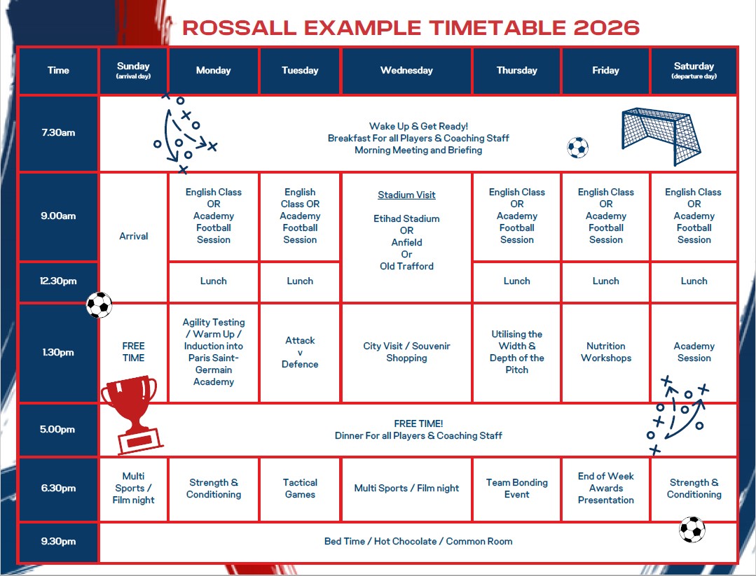 Oferujemy tu połączenie kursu języka angielskiego (15 lekcji/tydz.) z pakietem 25 treningów piłkarskich (tygodniowo) przy współpracy z Akademią Paris Saint-Germain UK. Program szkoleniowy został opracowany przez personel techniczny PSG zgodnie z filozofią paryskiego klubu i jest prowadzony przez trenerów UEFA. Każdy uczestnik będzie miał okazję rozwijać swoje umiejętności panowania nad piłką, dryblingu, podań, strzałów i gry w powietrzu, a także zaprezentować swoje umiejętności w meczach. Akademia jest otwarta na uczniów o rozmaitych umiejętnościach, a trenerzy ściśle współpracują z każdym dzieckiem, aby dostosować trening do jego poziomu. Uczniowie podzieleni są na dwie grupy wiekowe: 8-12 lat i 13-17 lat. Każdy uczestnik na początku obozu otrzymuje welcome pack (plecak, identyfikator, zeszyt, długopis) oraz zestaw treningowy (koszulka, spodenki, skarpety). Na zakończenie obozu uczniowie dostają certyfikaty ukończenia kursu od nauczyciela, a od trenera - kartę raportu, dzięki czemu po powrocie do domu mogą dalej rozwijać swoje umiejętności piłkarskie.
