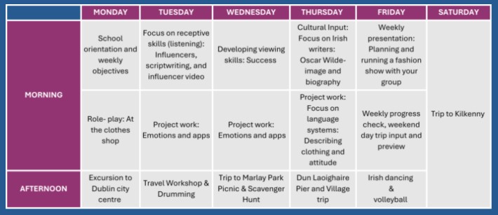 Program aktywności pozalekcyjnych obejmuje m.in. zajęcia sportowe, wycieczki kulturowe czy warsztaty projektowe rozwijające zdolności komunikacyjne (m.in. zajęcia z użyciem narzędzi multimedialnych dla stworzenia własnego portfolio, podcasty, blogi, newslettery itp.). W cenie programu (w każdym tygodniu) znajdują się różne aktywności popołudniowe, min. dwie wycieczki półdniowe oraz wycieczka całodniowa w Sobotę. Niedziela jest dniem wolnym, spędzanym z rodziną goszczącą.
