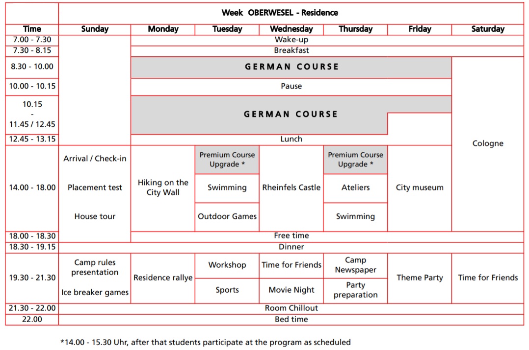 Oprócz zajęć językowych studentom organizowany jest także czas wolny. Większość aktywności odbywa się na terenie kampusu, pod stałym nadzorem naszych opiekunów. Aktywności są różnorodne, organizowane po lekcjach, popołudniami, jak i wieczorami. Organizujemy także całodzienne wycieczki w weekend (jedna w każdym tygodniu) - odwiedzamy takie miejsca jak: Koblenz, Bingen, Rüdesheim czy Mainz.