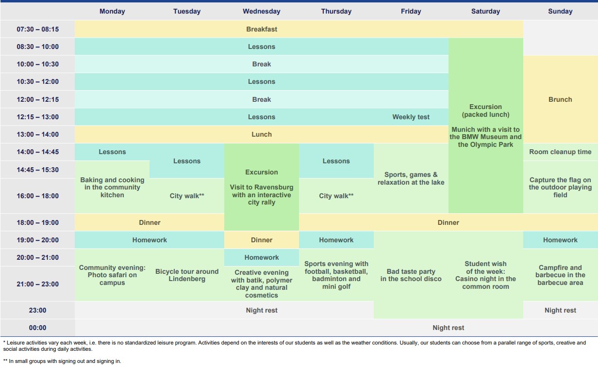 Uzupełnieniem nauki jest bogaty program zajęć pozalekcyjnych, który służy rozwijaniu umiejętności językowych oraz integrowaniu uczestników kursów ze sobą i z niemieckojęzycznym otoczeniem. Studenci biorą udział w zajęciach sportowych (badminton, koszykówka, bilard, ścianka wspinaczkowa, jazda rowerowa, itp. ), artystycznych (gra na pianinie, warsztaty plastyczne), zabawach integracyjnych (dyskoteka, wspólne barbeque). Gwarantujemy również (w każdym tygodniu) wycieczkę półdniową po atrakcyjnych miejscach w okolicy i wycieczkę całodzienną w weekend (m.in. Konstancja, Stuttgart, Monachium, Lindau, Mainau, Meersburg).