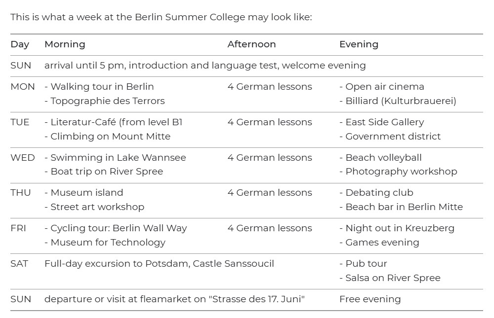 Zajęcia odbywają się popołudniami, pozostawiając uczniom czas na odkrywanie miasta przed lekcjami. W trakcie trwania obozu, w każdym tygodniu gwarantowane są co najmniej dwie aktywności dziennie oraz całodzienna wycieczka w sobotę (np. Pocztam, Drezno, Jezioro Zeuthen). Aktywności poranne skupiają się na mieście, jego sztuce i kulturze oraz na zajęciach warsztatowych m.in. ze street artu czy fotografii. UWAGA! Uczniowie muszą samodzielnie zakupić bilety na komunikację miejską (średnio 80-110 EUR za 2-4 tygodnie).