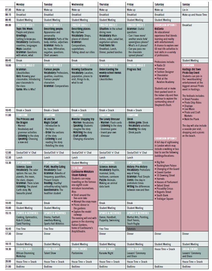 Program obozu zawiera w sobie lekcje angielskiego, jak i szereg różnorodnych aktywności na kampusie i poza nim. Uczniowie biorą udział w zajęciach sportowych, warsztatach artystycznych, grach i zabawach integracyjnych, a także wycieczkach i wydarzeniach kulturalnych. W każdą środę odbywa się wycieczka półdniowa, a w weekendy - całodniowa (np. do Brighton Czy Londynu). Dodatkowo, możliwe jest wykupienie pakietów dodatkowych aktywności - to opcja szczególnie dla tych, którzy mają już konkretne zainteresowania i umiejętności, które chcą rozwijać. Tutaj do wyboru m.in. pieczenie i dekorowanie, film i animacja, opieka nad zwierzętami, jazda konna, tenis (niektóre opcje dostępne tylko w konkretnych datach obozowych, o szczegóły pytaj w Glossa).