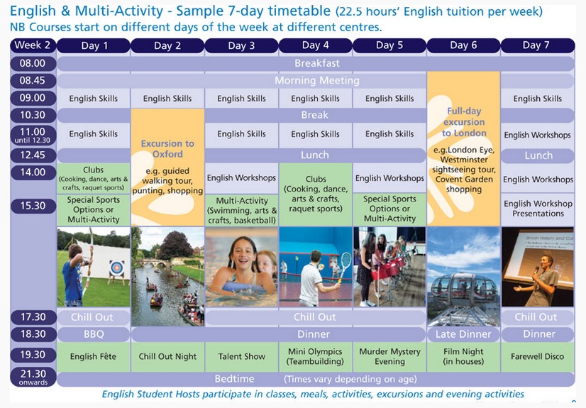 Program dnia jest tak przygotowany, aby łączył w sobie systematyczną naukę angielskiego z dobrą zabawą oraz aktywnym wykorzystaniem czasu wolnego. Codzienne zajęcia językowe zostały przygotowane w oparciu o najnowsze metody pracy ze wskazaną grupą wiekową. Rozwijają one słownictwo i umiejętność praktycznego wykorzystania angielskiego w komunikacji językowej. W ramach zajęć pozalekcyjnych dzieci mają wiele okazji do spotkań z dziećmi angielskimi, które także uczestniczą w obozie - tym samym mogą ćwiczyć język w naturalnych, codziennych sytuacjach.
