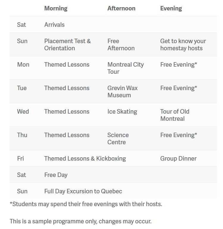 Oprócz zajęć językowych, organizujemy dla młodzieży również ich czas wolny. W tygodniu codziennie popołudniu i wieczorem organizowane są różnorodne zajęcia w terenie (np. wycieczki do muzeów czy centrum naukowego; festiwal jazzowy, koncerty, wyjście na pokaz Cirque du Soleil; piknik, dyskoteka) a w sobotę odbywa się całodniowa wycieczka (Ottawa, Quebec). Niedziela to czas na aktywności organizowane na kampusie lub dalsze zwiedzanie miasta. Dajemy również czas wolny - uczniowie (po uzyskaniu wcześniej pisemnej zgody rodzicielskiej), mogą również samodzielnie odkrywać miasto.