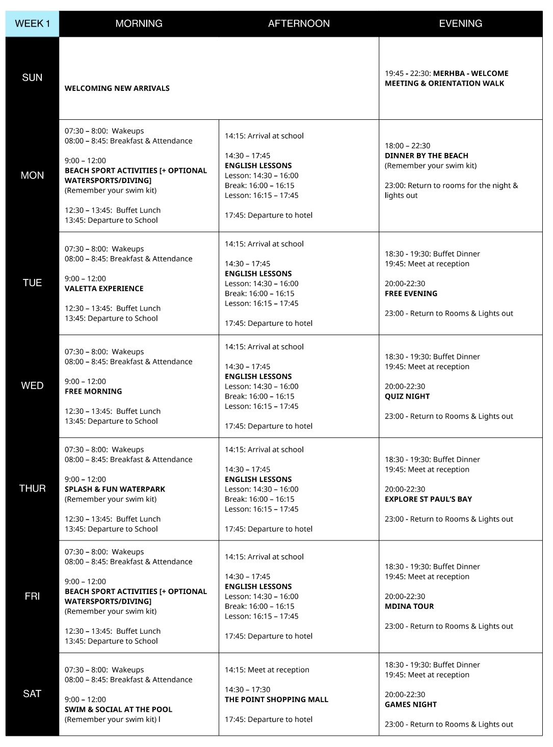 Nasz młodzieżowy obóz odbywa się w naszej głównej szkole na Malcie, w St. Paul’s Bay – w malowniczym miasteczku położonym w północno-wschodniej części Malty, w spacerowej odległości od Buġibba. To miejsce pełne zabytkowych budynków, osobliwych sklepików, modnych butików, restauracji i kawiarni. Pobliska miejscowość Mellieha jest kolejnym popularnym miejscem turystycznym, w którym znajduje się najdłuższa i najpiękniejsza piaszczysta plaża na wyspie, stwarzająca idealne warunki do pływania, gry w siatkówkę plażową lub po prostu opalania się. Możesz tu także ćwiczyć wiele sportów wodnych, takich jak nurkowanie z rurką, żeglarstwo lub windsurfing!