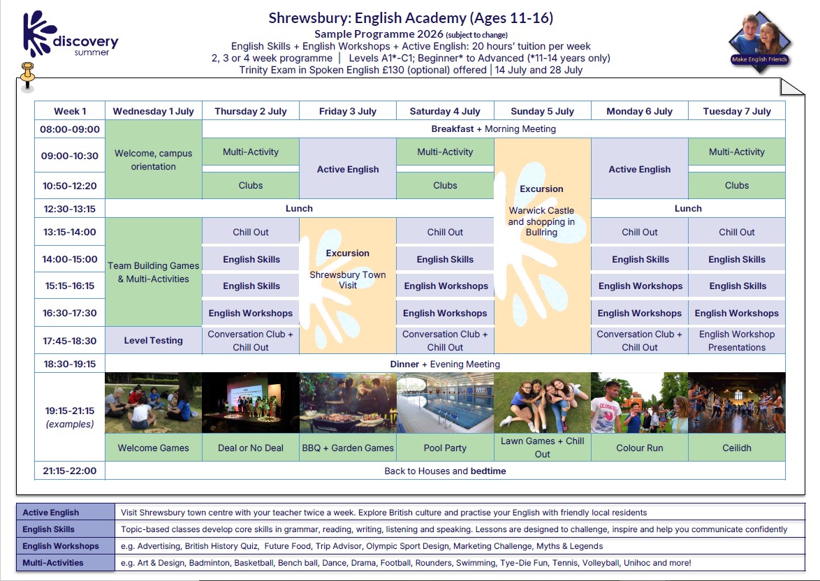 W Shrewsbury uczniowie mogą liczyć nie tylko na standardową naukę języka angielskiego, ale także na zdobywanie doświadczenia w pracy zespołowej czy rozwój umiejętności przywódczych. Jest to jednocześnie doskonała okazja do praktycznego ćwiczenia języka, jak i fantastyczna wakacyjna przygoda. Program kursu językowego składa się z: